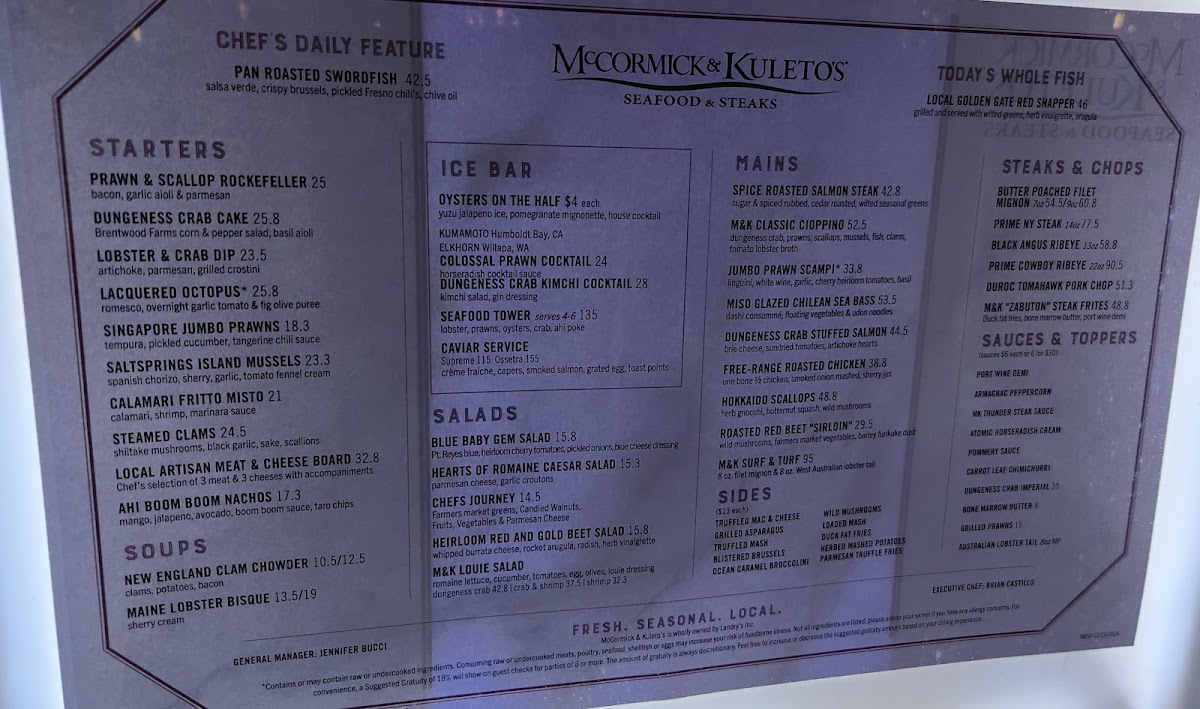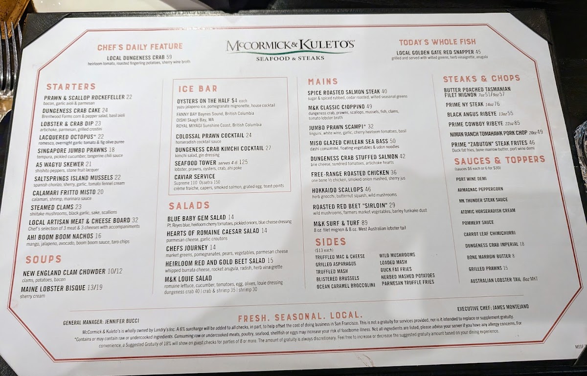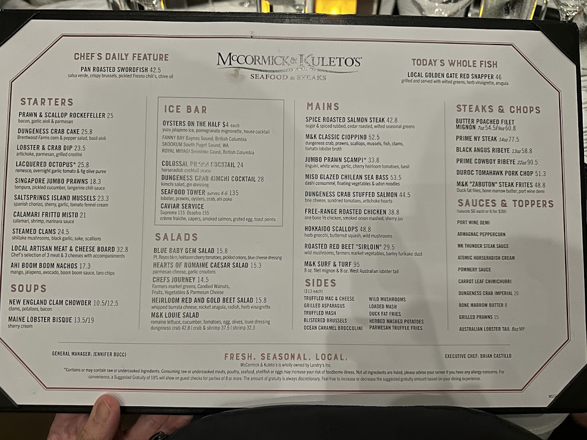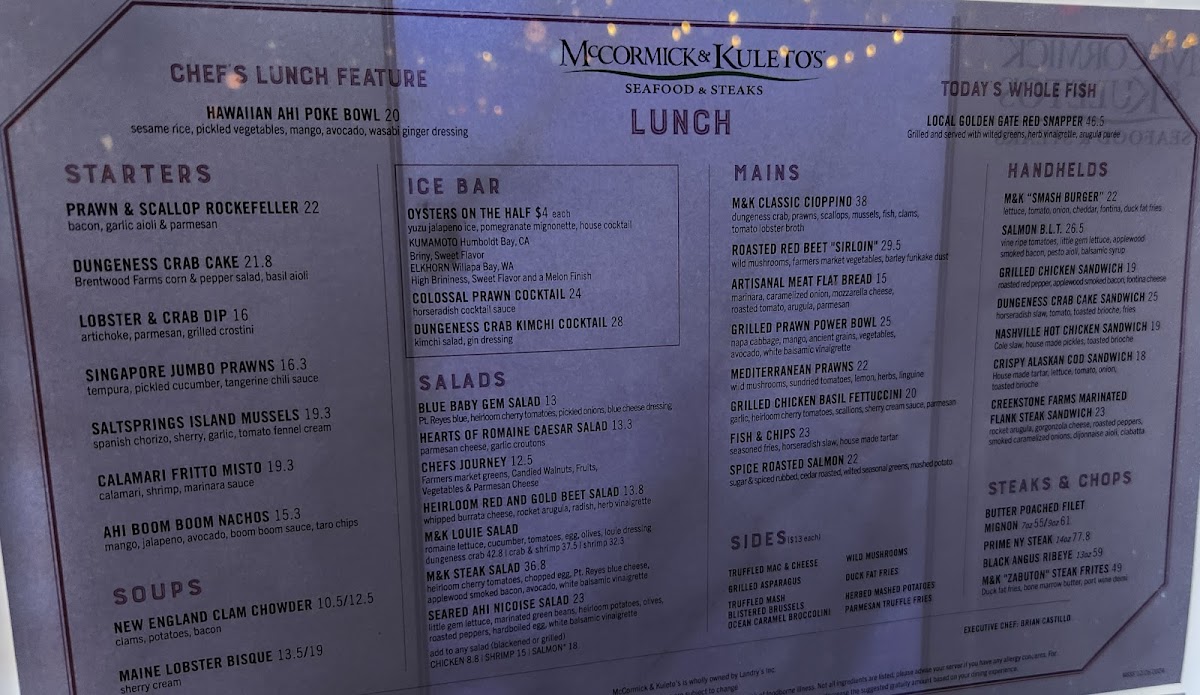 The menu at McCormick & Kuleto's Seafood & Steaks features a diverse selection focusing on seafood and American steakhouse offerings. It is organized into categories that include handheld sandwiches, appetizers, main courses, and desserts.