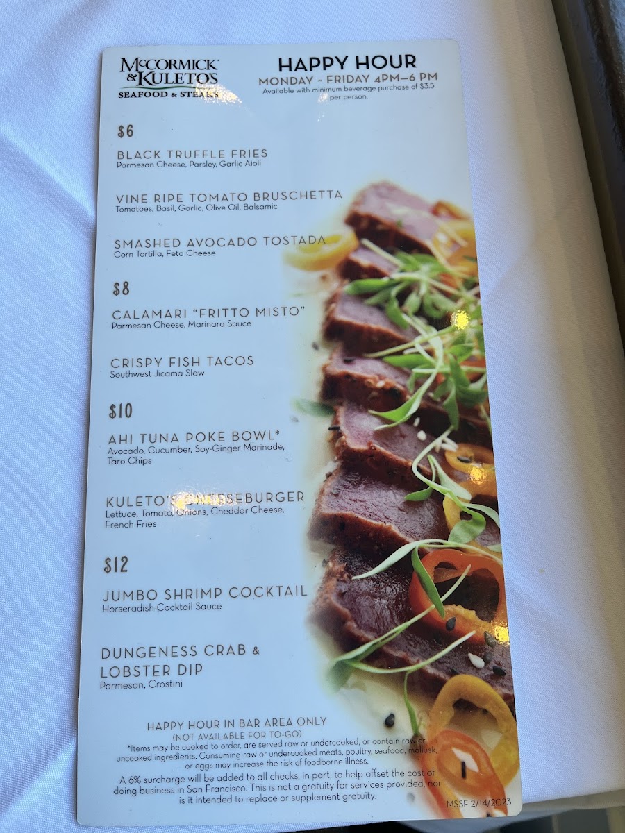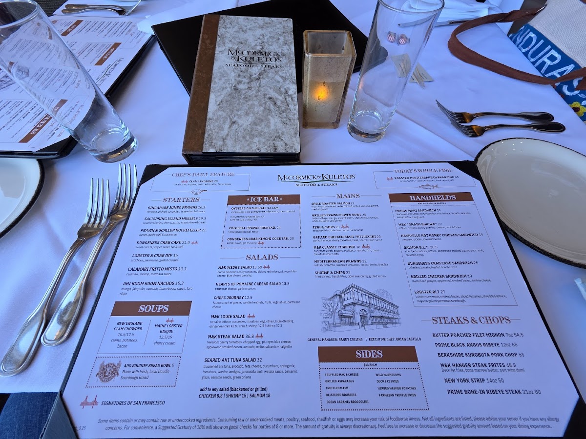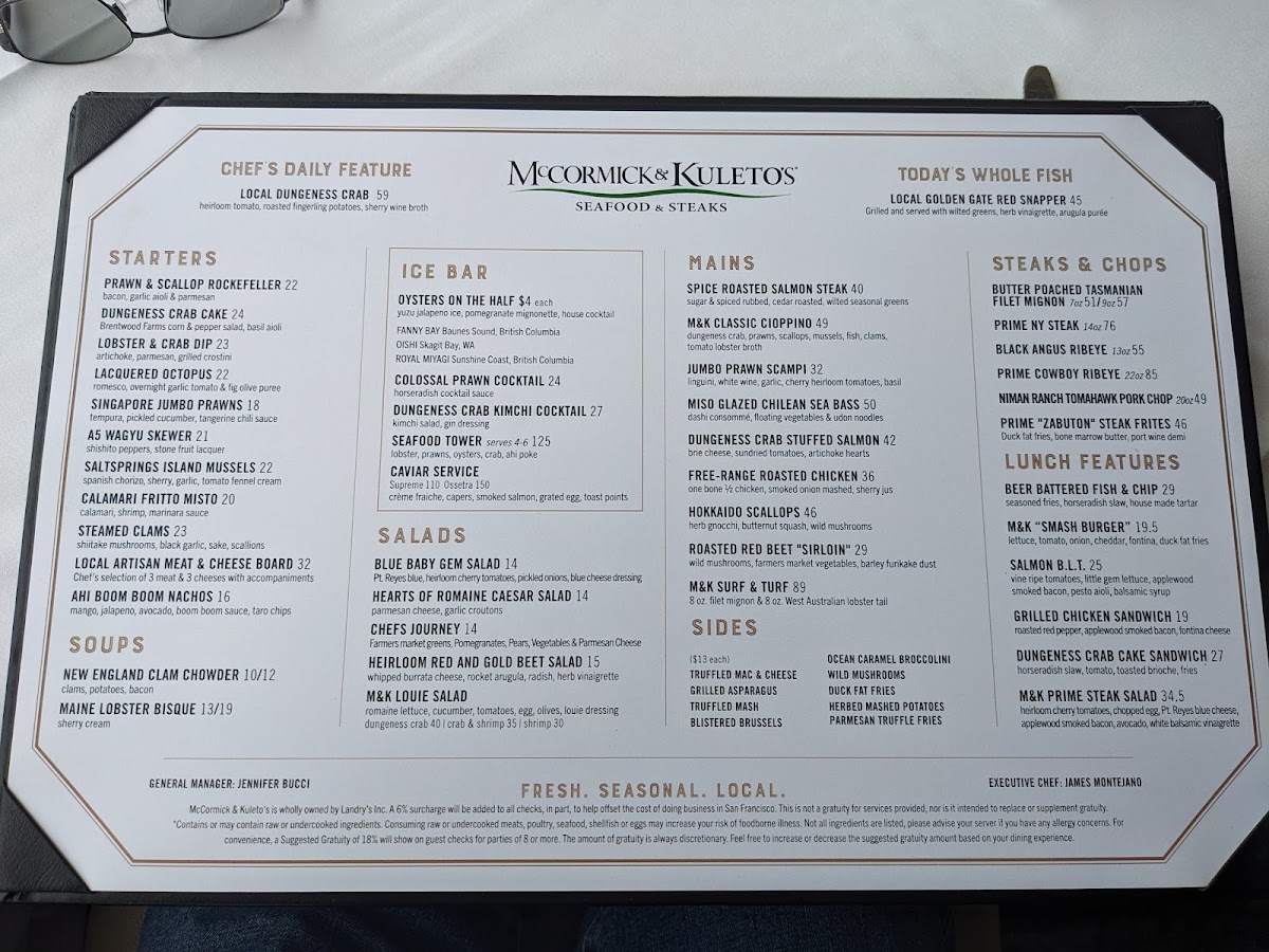 The menu at McCormick & Kuleto's Seafood & Steaks features a diverse selection focusing on seafood and American steakhouse offerings. It is organized into categories that include handheld sandwiches, appetizers, main courses, and desserts.